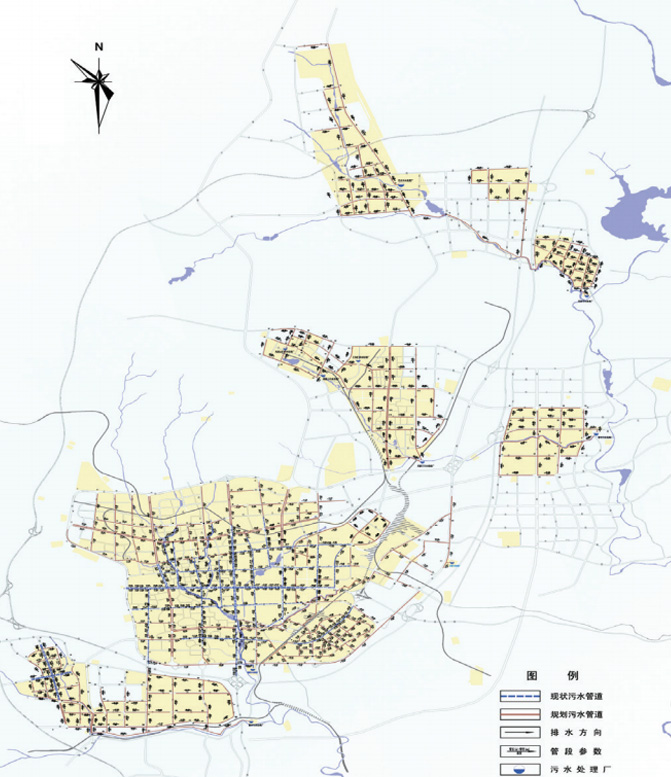 規(guī)劃采用雨污分流排水體制,舊城近期難以全面改造的應(yīng)利用現(xiàn)有設(shè)施采用截流式合流制,并逐漸向分流制過渡。根據(jù)晉城山地丘陵城市地形地貌,規(guī)劃按照河流水系分區(qū)采取組團(tuán)式獨(dú)立排水系統(tǒng),中心城市污水規(guī)劃為 5 個(gè)獨(dú)立的排水系統(tǒng),即主城區(qū)白水河流域排水系統(tǒng);金村區(qū)北石店河流域排水系統(tǒng)、北石店區(qū)排水系統(tǒng)、南村區(qū)申匠河流域排水系統(tǒng)、巴公、高都區(qū)污水排水系統(tǒng)。各排水系統(tǒng)均設(shè)污水處理廠,共規(guī)劃 8 座城市污水處理廠,雨水就近排入河流。規(guī)劃對(duì)污水再生資源化利用進(jìn)行了科學(xué)預(yù)測(cè),對(duì)再生水利用的方式與途徑進(jìn)行了合理規(guī)劃,將再生水管網(wǎng)布局與城市道路建設(shè)與改造相結(jié)合,同步實(shí)施,同步建設(shè)。