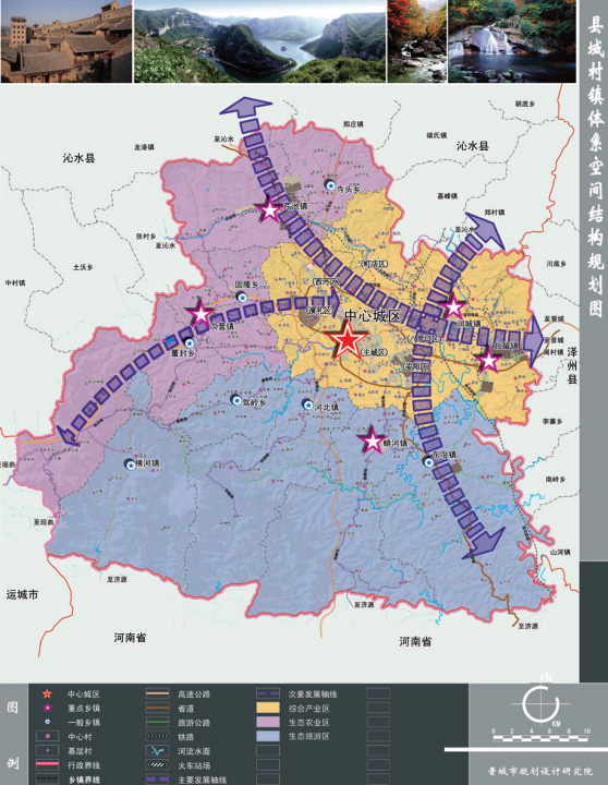 規(guī)劃按照“非均衡集中式”的城鎮(zhèn)化發(fā)展策略,以“1+5”大縣城為城鎮(zhèn)化核心區(qū)域,著力提升重點城鎮(zhèn)的城鎮(zhèn)綜合承載能力,推進縣域城鎮(zhèn)化發(fā)展質(zhì)量和水平。規(guī)劃提出“工業(yè)向園區(qū)集中,農(nóng)民向集鎮(zhèn)集中,農(nóng)地向規(guī)模生產(chǎn)專業(yè)戶集中”的集約型城鎮(zhèn)化道路。在產(chǎn)業(yè)發(fā)展方面,提出了“以煤為基、多元發(fā)展”的產(chǎn)業(yè)發(fā)展路徑,構(gòu)建“1+4” 產(chǎn)業(yè)空間布局,盡快擺脫一煤獨秀的發(fā)展格局。在村莊建設(shè)方面,按照因地制宜、分類指導(dǎo)的原則,將縣域村莊分為城鎮(zhèn)拉動型、交通引導(dǎo)型、工礦型、特色旅游型、特色農(nóng)業(yè)型等五個類別,通過撤遷并轉(zhuǎn)等模式,減少村莊數(shù)量,擴大中心村規(guī)模,完善村莊設(shè)施,改善村民生產(chǎn)生活條件。