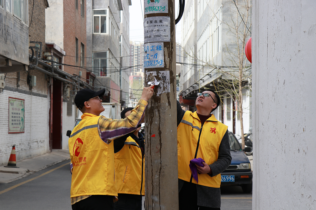講座結束后,志愿者們深入到社區(qū)街巷,認真清除墻壁上的“牛皮癬”小廣告,對街巷內(nèi)的煙頭、飲料瓶等垃圾進行清掃撿拾,并勸導各類不文明行為。